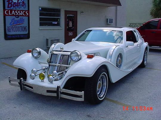 Here is yet another of our best selling Neo-Classic autos of all time.we have now sold well over 80 of these great cars. . These cars are factory built in Miami, by Classic Motor Carriages, on brand new Mercury Cougars. This is not a kit car at all.Has the styling of the mid 1930s Mercedes, & loaded with every possible creature comfort-like a $1500. optional power smoked sunroof with sunshade, keyless entry, climate control air conditioning & heater, premium sound system with am/fm stereo w/cassette, full digital dash w/computer, automatic light dimmers, dual light up vanity mirrors, twin fold down armrests, tilt & cruise control, leather wrapped steering wheel, Tiffany floor mats, powered by a peppy 5.0 -302 V8 motor, with automatic transmission & overdrive, power seats, windows, locks, mirrors, brakes & steering, 6 real wire wheels, dual side mounted spares w/covers, 3 leather trunk straps, 2 piece stainless bumpers, side supercharger pipes, 4 trumpet horns, dual amber fog lamps, badge bar w/2 badges, side landau bars & opera lights tinted windows, & pinstripes, snow white paint with red velour interior-that stays cool in the hot summers, & warm in the cold winters. 18 1/2 feet long--same aa a Lincoln Town car, & it has a huge 145" wheelbase-like the cars had in the Gatsby days. These cars can be used as daily drivers & have a big 25 gallon gas tank, & turn heads everywhere. Tons of room inside, so car can be used for weddings etc., & can hold 5 adults, easily. These cars would cost well over $75,000. to build today. return to Bob's Classics, Inc. or What's In Stock. Give us a call at 727-581-9406 |