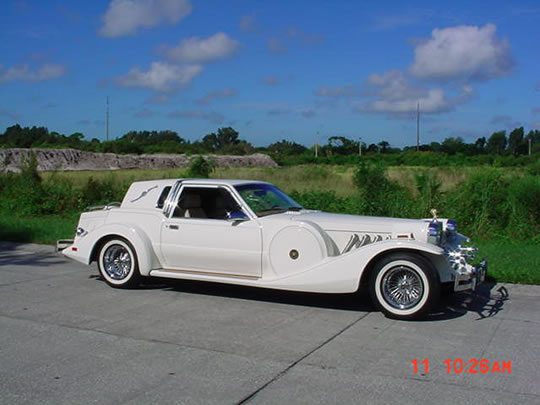 This is the 2nd to last year of the regular Zimmer production line. This one is out of a South California Estate sale! Always garaged & covered & even comes with the expensive & Rare-Zimmer custom car cover. New 2004 Zimmers are now around $100,000. & going up all the time. This car has the rare custom wrinkled cream leather look, & fully powered- by Recaro, of course, & has walnut piping on the seats, tan plush carpets, even in the trunk, padded white opera top & trunk, to match the rich ivory body paint, Nardi gold spoked wood steering wheel, woodgrain dash, consol & door inserts, custom wood shifter knob, real stainless wire wheels, & wide white radial tires, teak on running boards & trunk-with a stainless luggage rack, $850. solid bronze-gold plated eagle hood ornament, opera lights & windows, landau bars, wind deflectors, dual exhaust, twin lite up vanity mirrors, tilt, cruise, air conditioned, heater, power seats, trunk, gas door, antenna, locks, mirrors, windows, brakes & steering, 4 speed automatic w/overdrive, multi port fuel inj 5.0 liter 302 Ford V8, & built on a brand new Mustang, 4 trumpet horns, twin fog lights, 2 piece stainless bumpers, side supercharger pipes, halogen headlights, 4 seater, & more. Non smoker car with no pets, & still smells new, tinted windows, pinstipes-hand painted. 26MPG on Highway & 17MPG in city, battery cut off switch, front disc brakes, 18 feet long with 145" wheelbase. return to Bob's Classics, Inc. or What's In Stock. Give us a call at 727-581-9406 |