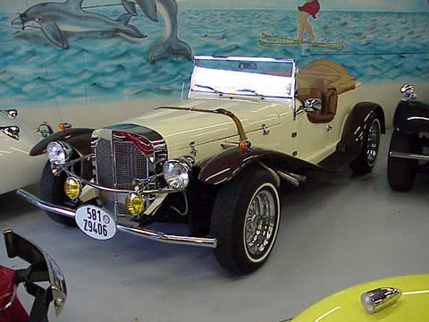 From Classic Motor Carriages in Miami-Model is the Gazelle Deluxe and was pro built & completed in Virginia,in 1987 & titled as a 1987 Gazelle. now has clean Florida title. powered by a Chevy Chevette engine,with rare automatic transmission, so its easy to drive & cheap on gas & parts are at any corner store garage. Body is fiberglass, so nothing can rust-ever, finish is gelcoat-like a boat,so scratches just buff out,has a heavy full frame-not V W, like the cheaper models, has a rear jump seat, rear mounted spare with custom spare tire cover,beautiful burlwood dash & steering wheel, 6 classic white faced gauges, rear luggage rack & small trunk, am/fm/stereo w/cassette, supercharger pipes, wind deflectors, chrome rims w/wire baskets, badge bar, dual amber fog lamps, twin trumpet horns, leather hood strap, 2 tone cream body with rich chocolate fenders,full tan converible top,& side curtains, with top parade boot, etc. a great little daily driver for short trips, beach cruisin,grocery getter,car shows,etc.these are great little cars for ver little bucks. Return to Bob's Classics, Inc. or What's In Stock. Give us a call at 727-581-9406 |