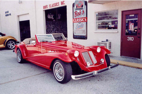 This is the very first Baci ever built by Basasie Automobile Company Inc., out of Milwaukee,Wisconsin. Handcrafted by the same family that also built the famous Excalibur cars. This is by far the most luxurious & best riding,of all the other Neo- Classic cars ever built. This car was shown in the Detroit Auto shows as well. built on a brand new 1991 Ford Thunderbird with drivers airbag, & powered by a very peppy 5.0 liter V8-Multi-Port fuel inj. with overdrive transmission, ice cold air conditioning, power convt. top, power seats, windows, locks, mirrors, trunk, antenna, steering & brakes !! Full tan leather interior & wood dash, consol & door inserts, tilt & cruise, leather wrapped steering wheel, real chrome wire wheels, white line radial tires, tinted windows, pinstripes, am/fm stereo w/cassette, dual fog lamps, side supercharger pipes, 2 piece hood, padded top boot, carpets-even in trunk, 2 piece windshield, & almost 3700 pounds & 16 1/2' long, nice soft bucket seats, wrap around dash, headrests, etc. nice rich guards red paint & tan vinyl top. everything you would expect in an $85,000. car & more. This is a rare 1st car of a total of 14 made. Return to Bob's Classics, Inc. or What's In Stock. Give us a call at 727-581-9406 |