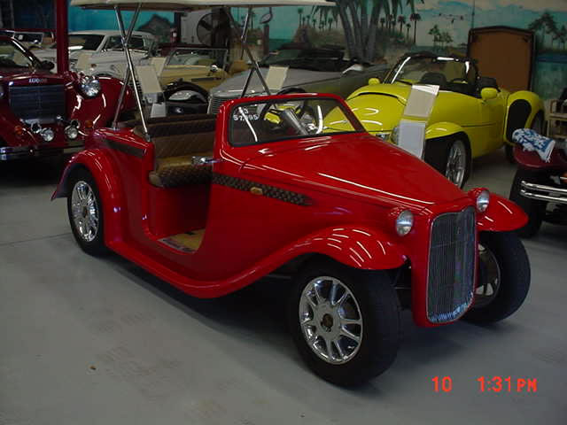 This is our 1st California Roadster electric car/cart, & its a 2003 & comes with a low speed title-like a car, & legal to drive on any roads with a 35mph speed, or less. it comes titled as a 2003 AGC, which is the manufactures initials, has a plug in the rear, to accept the optional golf bag holder, and is around 750 pounds, 127" long, 52" wide, 85" wheelbase & is 45" high, to the top of the windshield. has super fast take off with lots of torque. has 11 horsepower & a 400 amp speed controller, high speed gears, self adjusting rack & pinion steering, extended range rear end. This one has the optional quick release hard top, made of rotary molded plastic, with rain gutters, & its basically just to keep the sun off you. has seats for 4 people & is 48 volts, with 8 new 6 volt batteries, optional am/fm/cd player, locking storage up front, 2 locking glove boxes, 13" front polished alloy rims, & 14" in the rear, which give these a longer range to cruise, has 2 drink holders, does around 25 mph, & has a 1 piece fiberglass composite body & is street legal with a horn, turn signals, with built in indicator on the dash, headlights, running lights & custom tail lights, in dash charge indicator, lexan windshield, carpets, etc. return to Bob's Classics, Inc. or What's In Stock. Give us a call at 727-581-9406 |
