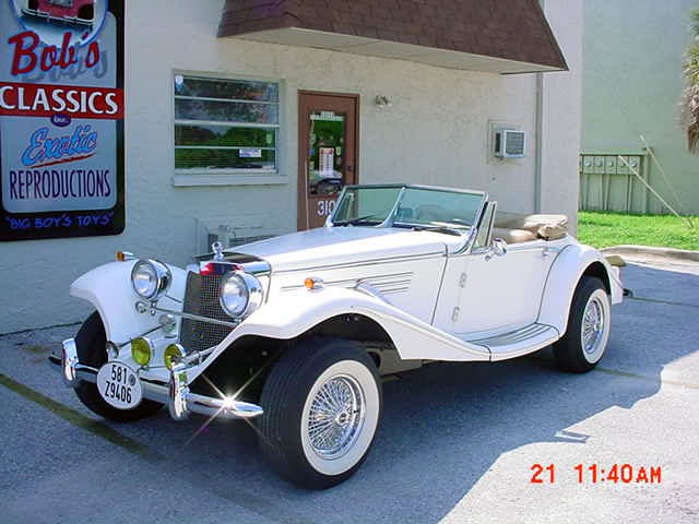 This is the smaller version of the 1934 Mercedes Heritage, but with the same classic lines.in 1936, Mercedes- Benz was commissioned to design a personalized model for international movie star- Marlene Dietrich, which was a smaller, easier to handle 500k Mercedes.if you could ever find one,they would cost in the millions of dollars. this car was from Classic Roadsters in Fargo, North Dakota, & was built i n1991 and is titles as a 1991 custom. powered by a peppy V6 Ford engine with a C4 automatic transmission, & air conditioning-which is very rare, & also a tilt steering column. roll up tinted glass windows, 2 piece tinted front windshield, beautiful solid burl wood dash with glove box, am/fm/stereo with cassette, wide white gangster style tires, chrome rims with wire baskets, tan top, top boot, & tonneau cover, will also have an oval Euro styled front tag installed, & twin trumpet horns, dual amber fog lamps-to dress up the front & we will also be installing 4 bumper uprights/ over riders to improve the front & rear styling.the car is just a bit under 15 feet long with 108" wheelbase, 65" wide, 51" high, with 5.5" ground clearance, locking doors & trunk, classic styled white face gauges ,and they weigh around 2300 pounds,so they get great gas mileage, & with all parts being Ford, they are very easy to maintain. return to Bob's Classics, Inc. or What's In Stock. Give us a call at 727-581-9406 |