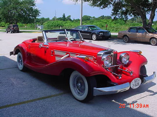 Our best selling replica, of all times, with over 80 of this model sold to date, is titled as a 1932 Mercedes, so it is exempt from emissions in most states & other countries. This one is very special indeed & would now cost around $90,000. to $100,000. to duplicate. Has only 5400 miles showing, & has new real chrome knock off wire wheels, new wide white radial tires & new custom tan canvas top, full pleated leather interior, wood steering wheel, powered by a peppy 5.7 liter 350 Chevy Goodwrench engine & a 350 automatic tranny, large trunk, no air, & heater, power brakes & steering, Mercedes emblems, classic styled gauges, custom carpets, soft top folds down out of sight, into a lift up tonneau cover,2 piece hood, & side supercharger pipes on both sides, rear mounted spare tire, 4" thick suicide doors, & car weighs 3750 pounds, so it rides great.twin trumpet horns, & most metal is stainless, which will never rust, & body is all fiberglass, which is good for life !! Originals are now 3.5 million bucks, so these replicas go up in value every year now. approx 17 feet long, with folding armrest, roll up glass windows, & tinted glass. these cars turn heads more than any other car out there. return to Bob's Classics, Inc. or What's In Stock. Give us a call at 727-581-9406 |
